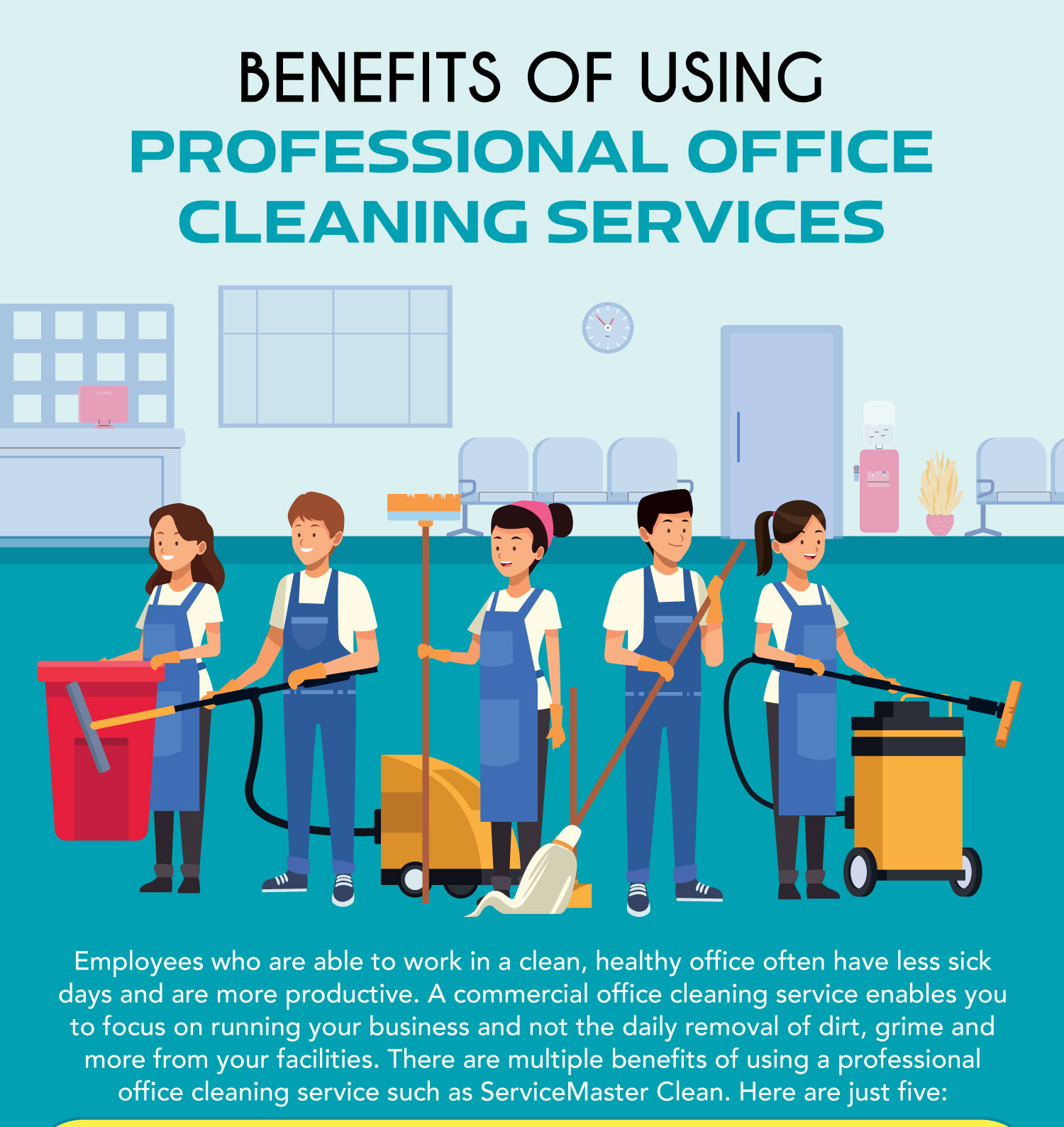 Employees who are able to work in a clean, healthy office often have fewer sick days and are more productive. A commercial office cleaning service enables you to focus on running your business and not the daily removal of dirt, grime, and more from your facilities. A professional office cleaning service such as ServiceMaster Clean has multiple benefits. Here are just five: