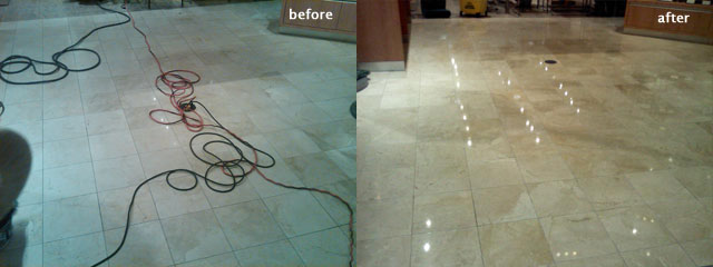 Excuse the cords in this before shot of one our very first marble restoration jobs in 2008. The result of this project was better than we could have imagined. As you can tell from the image, the shine and overall reflection from the lighting above increased dramatically. The diamond honing process we utilized was extremely labor intensive but proved to be the right system for this project. Initially we had to grind away the scratches with the most abrasive “Gorilla brand” diamond pad. Once the scratches were removed we worked our way back to a shine by repeating the process with lessor aggressive pads and polishing. As you can guess- the result was another satisfied client!