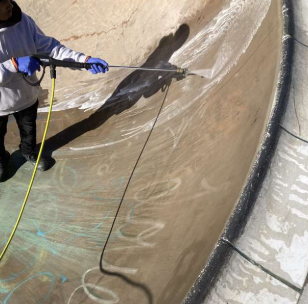 After rinsing, we waited for the concrete to dry completely and then examined the skatepark. The graffiti removal was an amazing success.