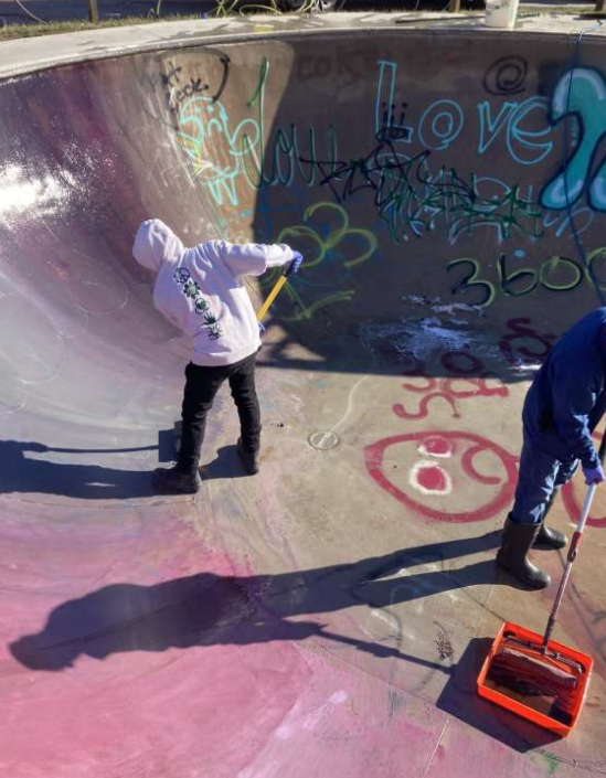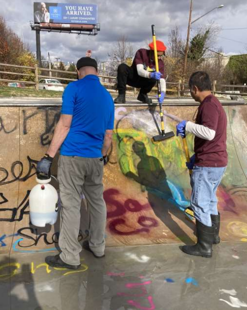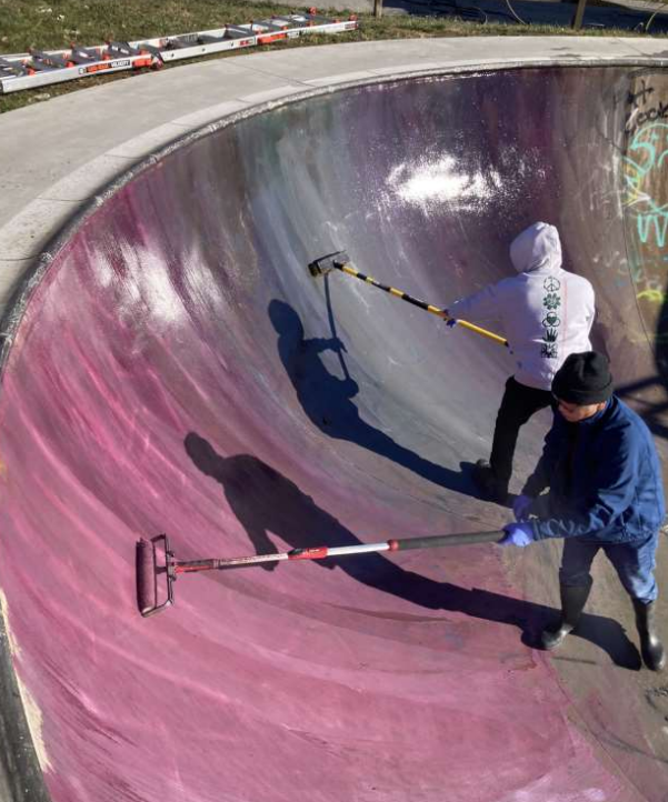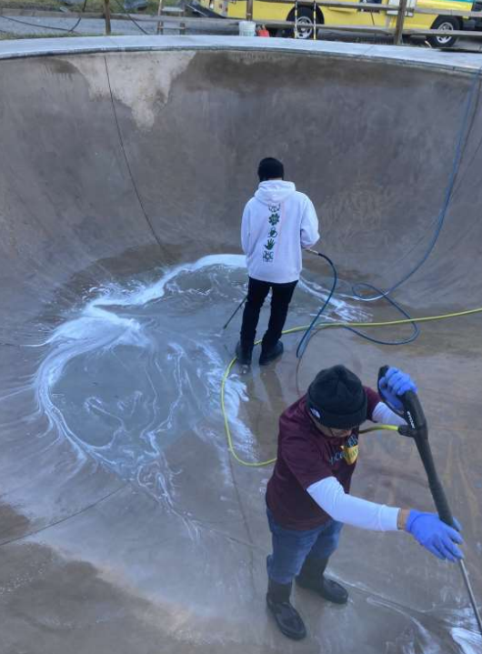 Because the skatepark surfaces are curved and angled, we determined that the paint rollers were best to apply the product. After the product was rolled onto the surface, we used deck brushes to agitate the chemical coating. As we worked, we learned just how important it was to allow proper dwell time as directed in the product direction. This project was completed in mid-December, so the cold temperature inhibited some of our progress, but following along with the instruction and repeating the process three times before rinsing was the key to success.