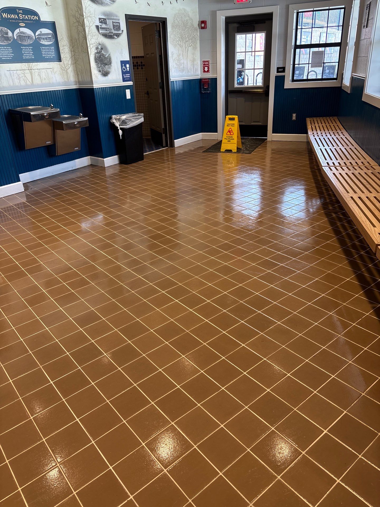 - Spot mopping of wet or slippery floor areas, especially near entrances during inclement weather